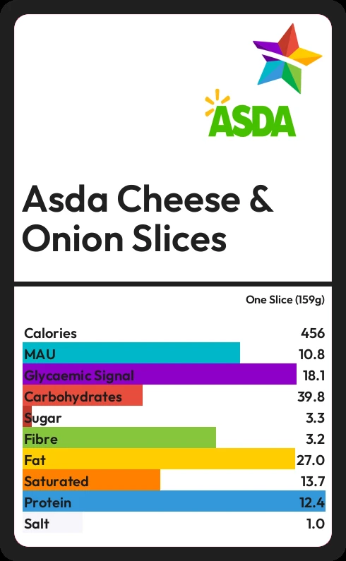 Asda Cheese & Onion Slices contains 456.3 calories in one Slice (159g).