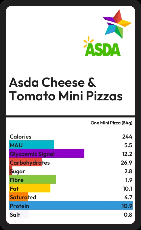 Asda Cheese & Tomato Mini Pizzas contains 243.6 calories in one Mini Pizza (84g).