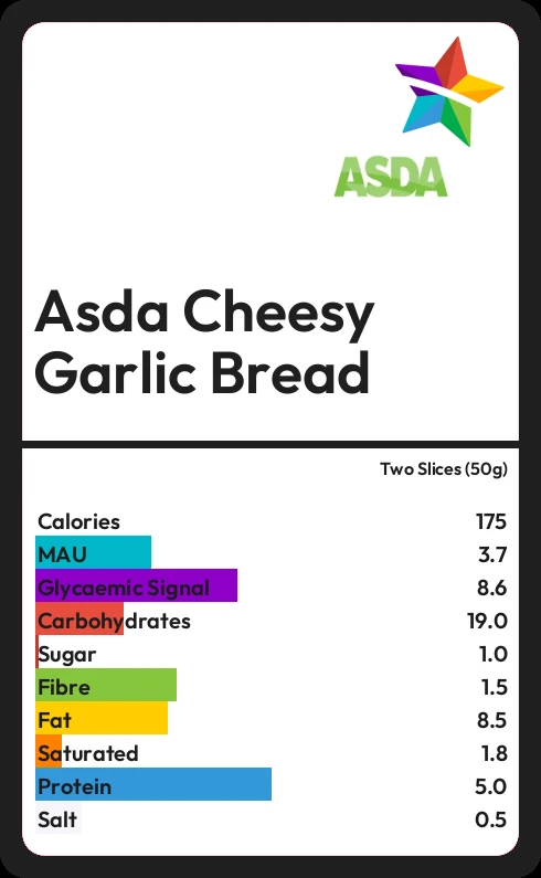 Asda Cheesy Garlic Bread contains 175.5 calories in two Slices (50g).