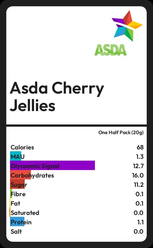 Asda Cherry Jellies contains 68.2 calories in one Half Pack (20g).