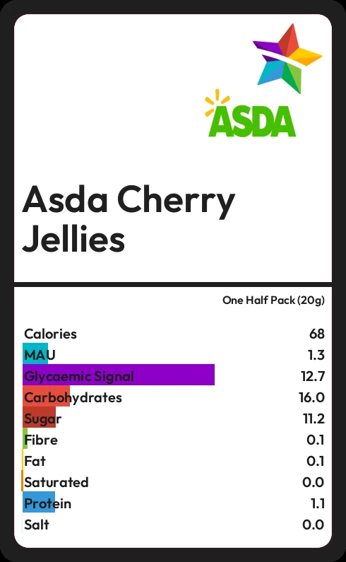 Asda Cherry Jellies contains 68.2 calories in one Half Pack (20g).