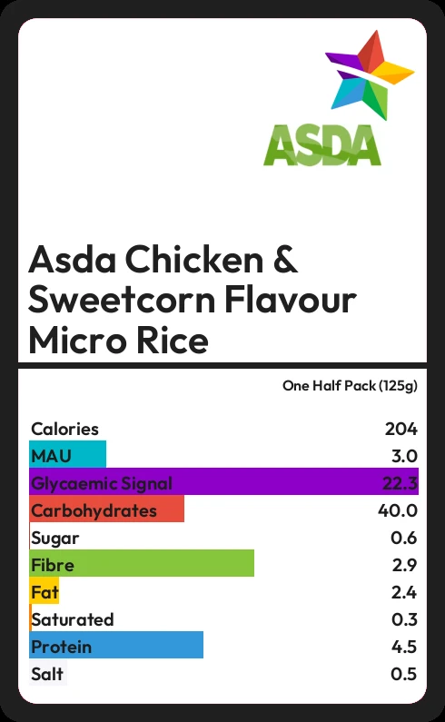 Asda Chicken & Sweetcorn Flavour Micro Rice contains 0.6g sugar in one Half Pack (125g)