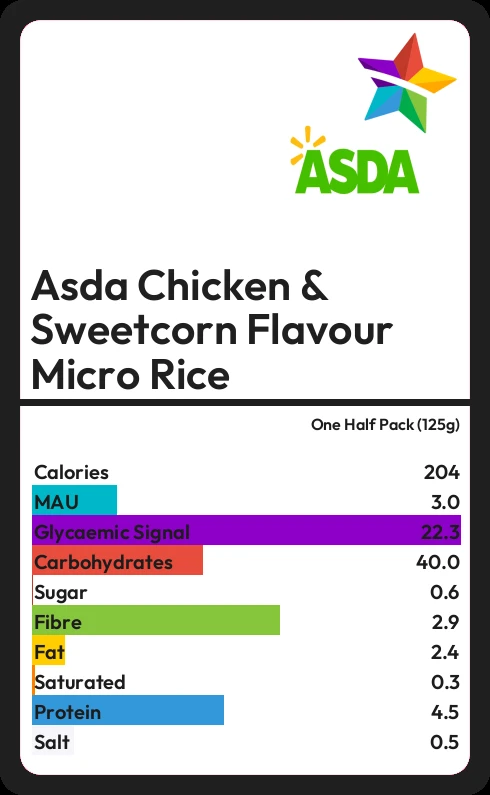Asda Chicken & Sweetcorn Flavour Micro Rice contains 0.6g sugar in one Half Pack (125g)