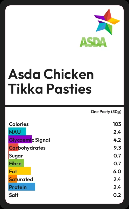 Asda Chicken Tikka Pasties contains 0.7g sugar in one Pasty (30g)