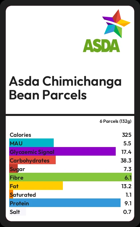 Asda Chimichanga Bean Parcels contains 324.7 calories in 6 Parcels (132g).