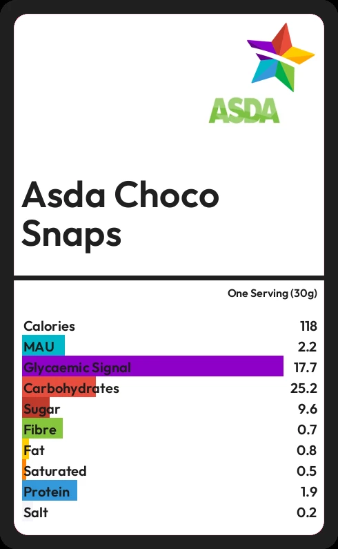 Asda Choco Snaps contains 117.9 calories in one Serving (30g).