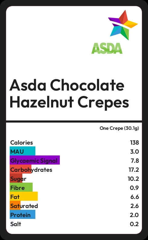 Asda Chocolate Hazelnut Crepes contains 10.2g sugar in one Crepe (30.1g) - that is around 3 cubes of sugar.