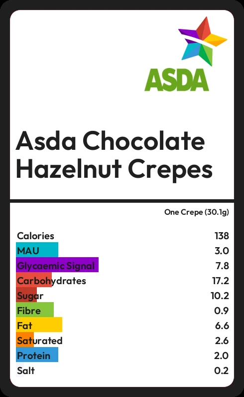 Asda Chocolate Hazelnut Crepes contains 138.2 calories in one Crepe (30.1g).