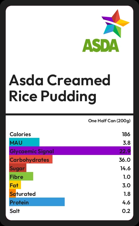 Asda Creamed Rice Pudding contains 186 calories in one Half Can (200g).