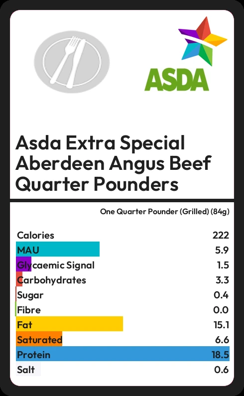 Asda Extra Special Aberdeen Angus Beef Quarter Pounders contains 0.4g sugar in one Quarter Pounder (Grilled) (84g)