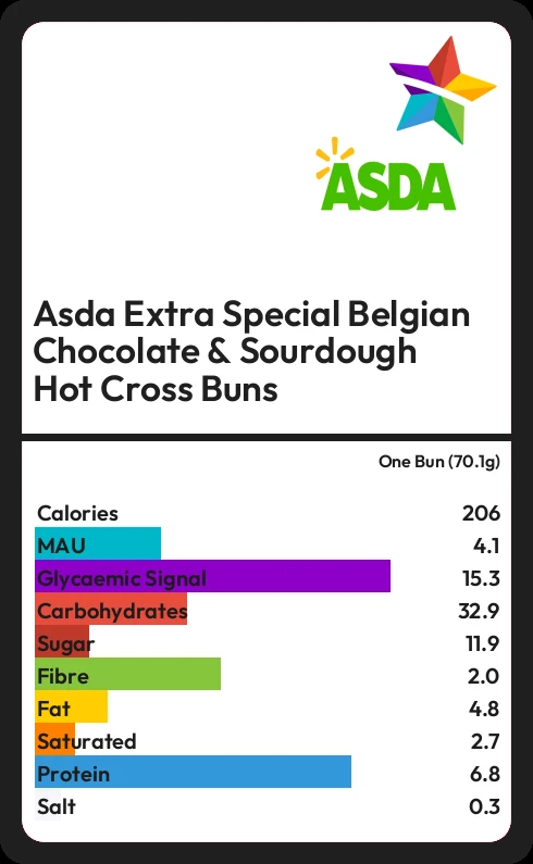 Asda Extra Special Belgian Chocolate & Sourdough Hot Cross Buns contains 11.9g sugar in one Bun (70.1g) - that is around 3 cubes of sugar.