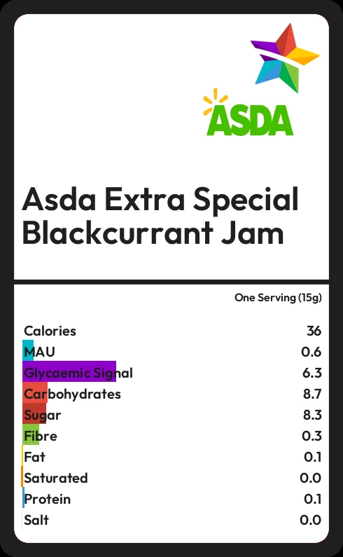 Asda Extra Special Blackcurrant Jam contains 36.5 calories in one Serving (15g).