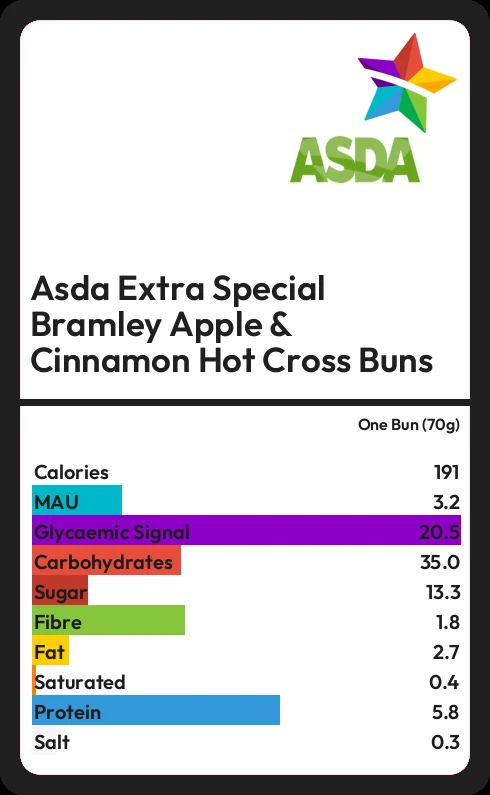 Asda Extra Special Bramley Apple & Cinnamon Hot Cross Buns contains 191.1 calories in one Bun (70g).