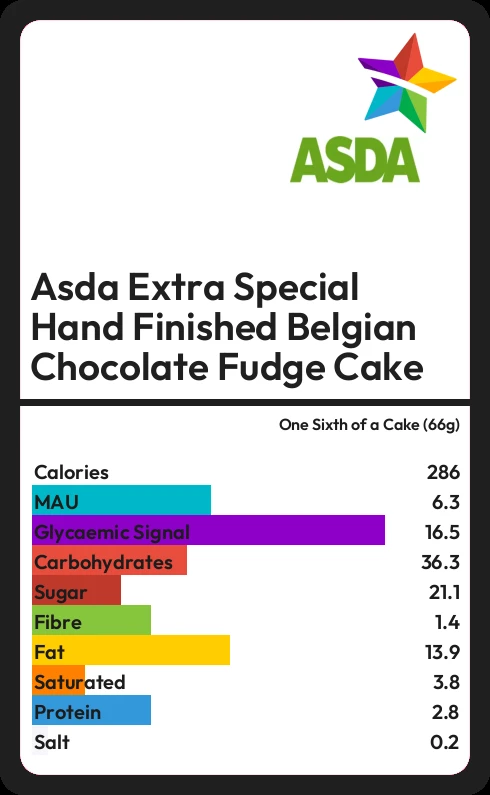 Asda Extra Special Hand Finished Belgian Chocolate Fudge Cake contains 21.1g sugar in one Sixth of a Cake (66g) - that is around 5 cubes of sugar.