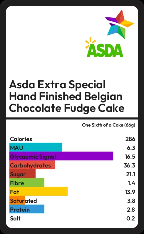 Asda Extra Special Hand Finished Belgian Chocolate Fudge Cake contains 21.1g sugar in one Sixth of a Cake (66g) - that is around 5 cubes of sugar.