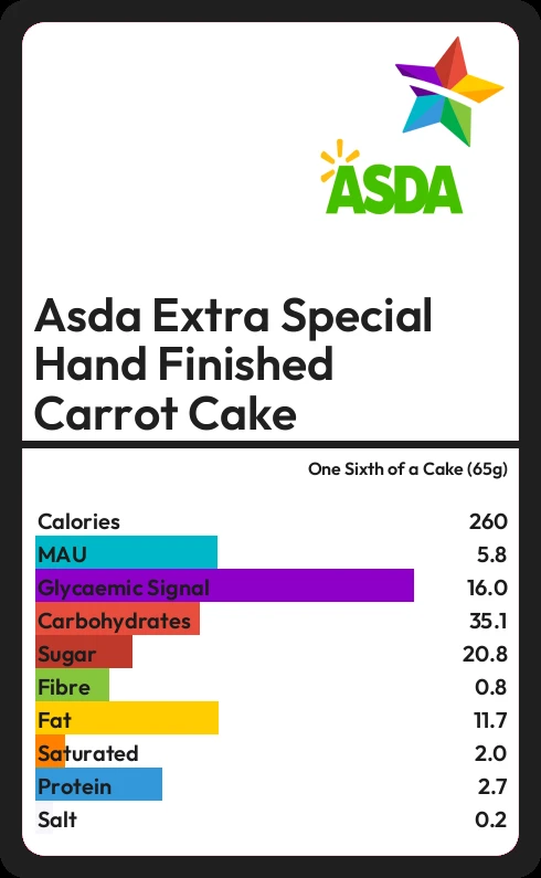 Asda Extra Special Hand Finished Carrot Cake contains 260 calories in one Sixth of a Cake (65g).