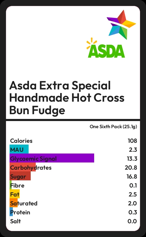 Asda Extra Special Handmade Hot Cross Bun Fudge contains 16.8g sugar in one Sixth Pack (25.1g) - that is around 4 cubes of sugar.