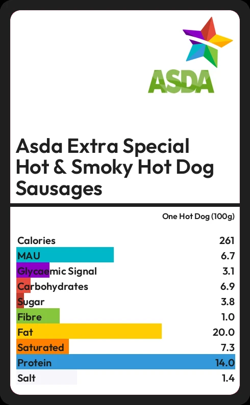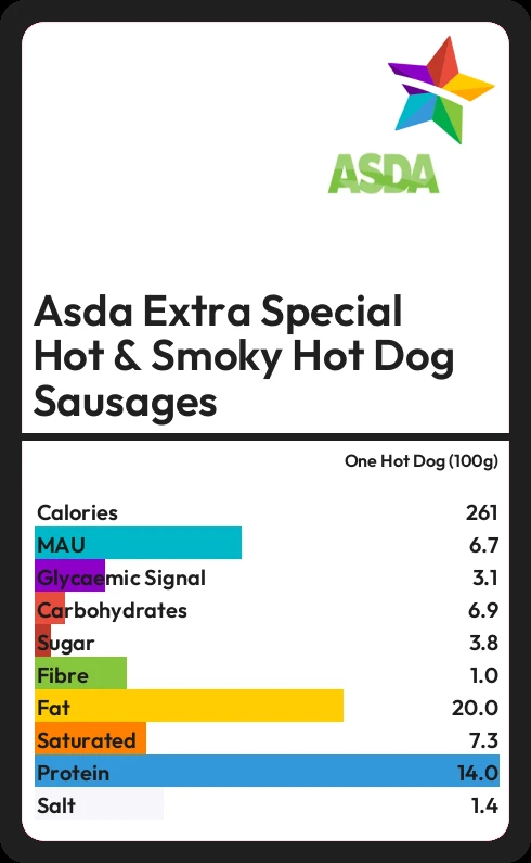 Asda Extra Special Hot & Smoky Hot Dog Sausages contains 261 calories in one Hot Dog (100g).