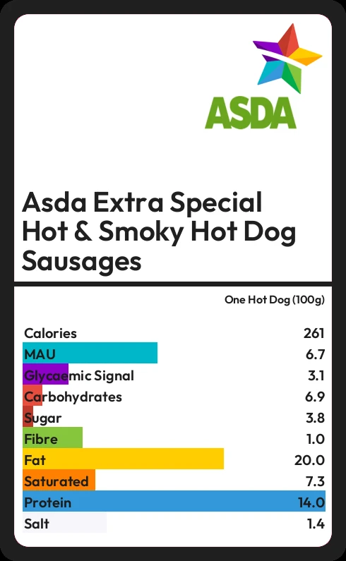 Asda Extra Special Hot & Smoky Hot Dog Sausages contains 261 calories in one Hot Dog (100g).