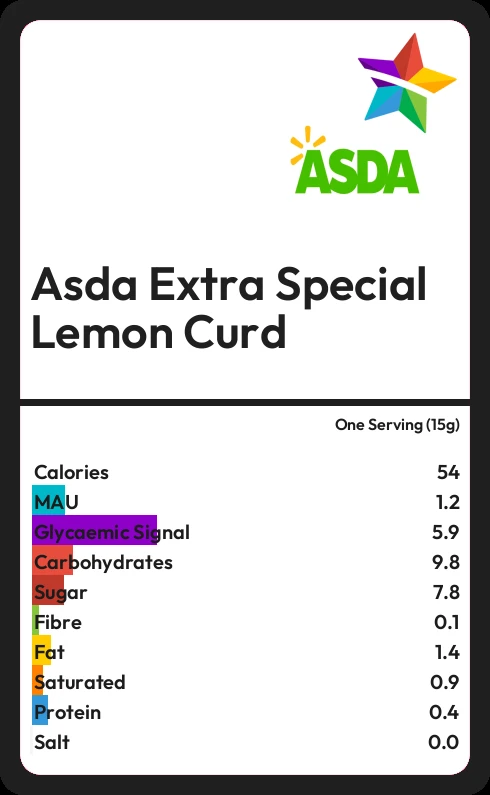 Asda Extra Special Lemon Curd contains 53.7 calories in one Serving (15g).