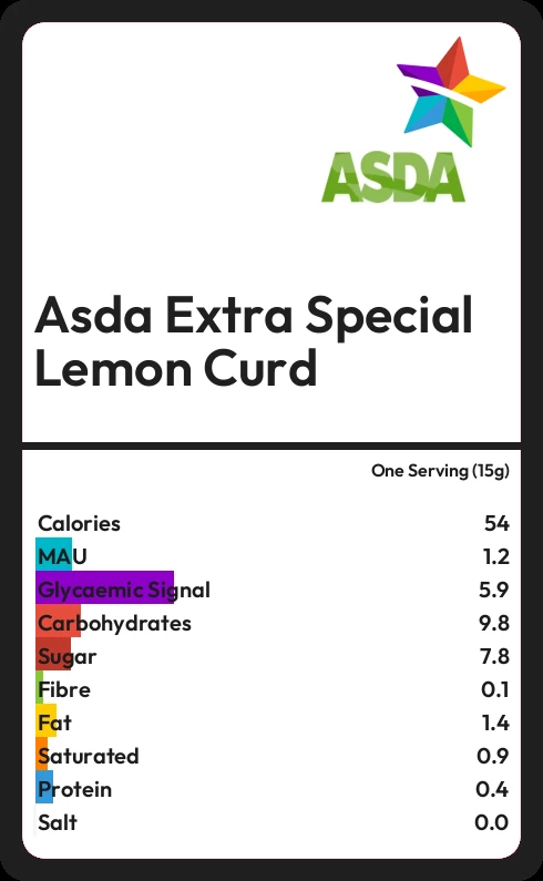 Asda Extra Special Lemon Curd contains 53.7 calories in one Serving (15g).