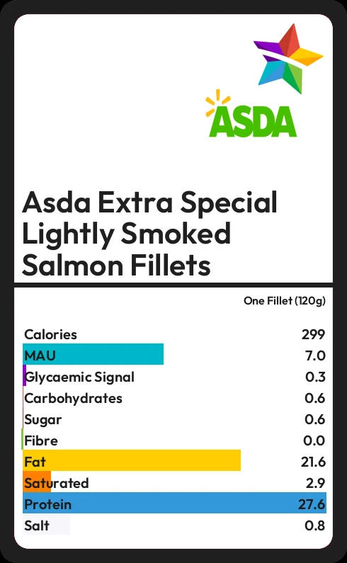 Asda Extra Special Lightly Smoked Salmon Fillets contains 0.6g sugar in one Fillet (120g)