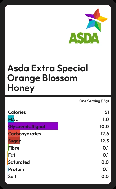 Asda Extra Special Orange Blossom Honey contains 51.2 calories in one Serving (15g).