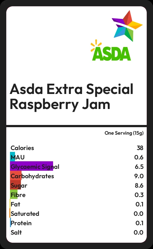 Asda Extra Special Raspberry Jam contains 38.1 calories in one Serving (15g).