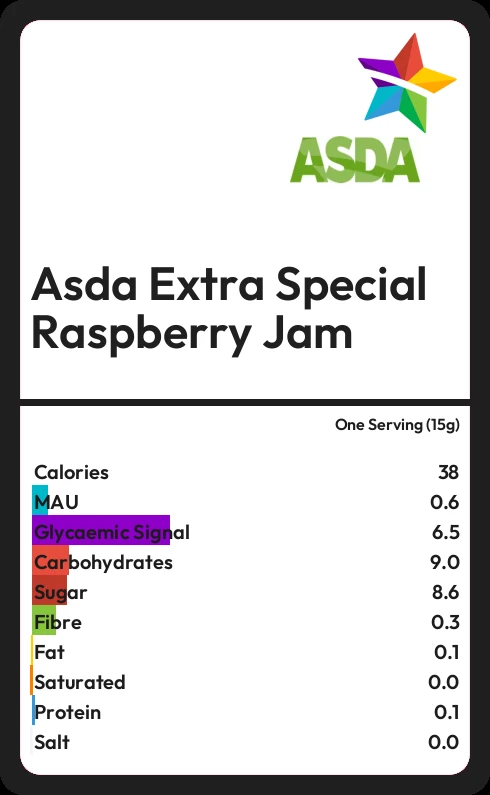 Asda Extra Special Raspberry Jam contains 38.1 calories in one Serving (15g).