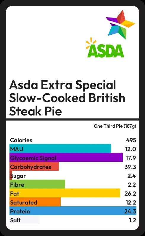 Asda Extra Special Slow-Cooked British Steak Pie contains 495.6 calories in one Third Pie (187g).