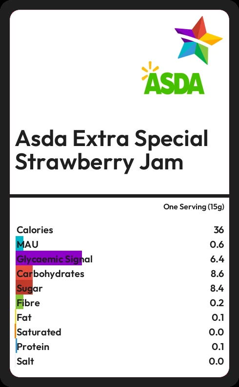 Asda Extra Special Strawberry Jam contains 35.7 calories in one Serving (15g).