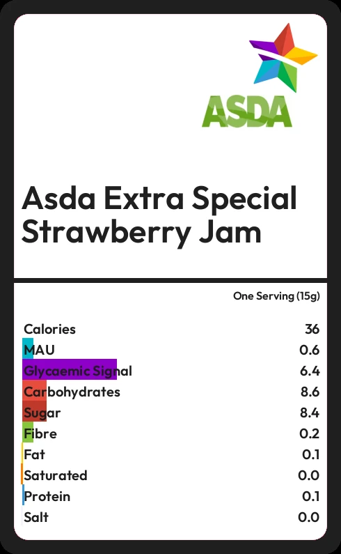 Asda Extra Special Strawberry Jam contains 35.7 calories in one Serving (15g).