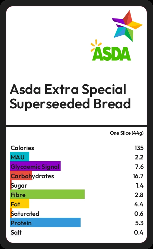 Asda Extra Special Superseeded Bread contains 1.4g sugar in one Slice (44g)