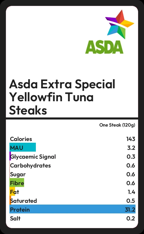 Asda Extra Special Yellowfin Tuna Steaks contains 0.6g sugar in one Steak (120g)