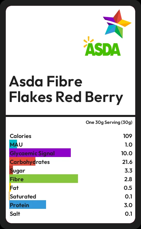 Asda Fibre Flakes Red Berry contains 109.2 calories in one 30g Serving (30g).