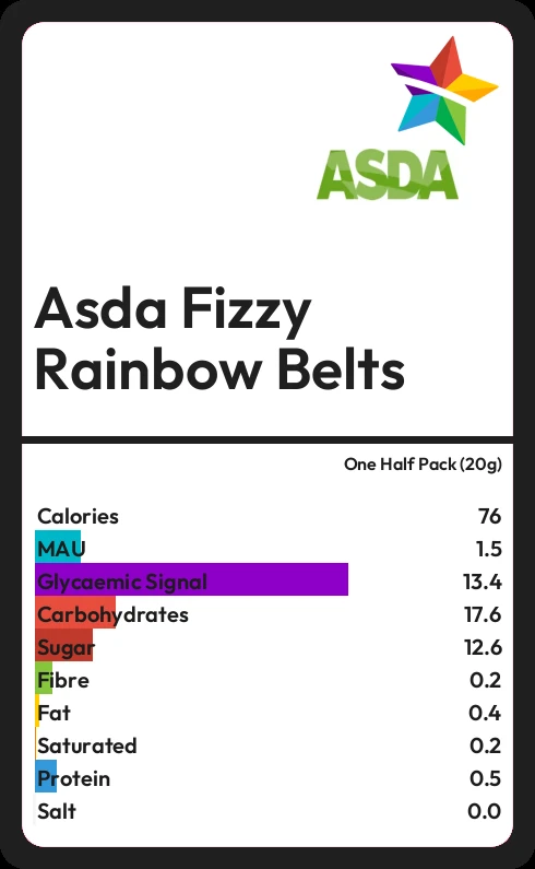 Asda Fizzy Rainbow Belts contains 75.6 calories in one Half Pack (20g).