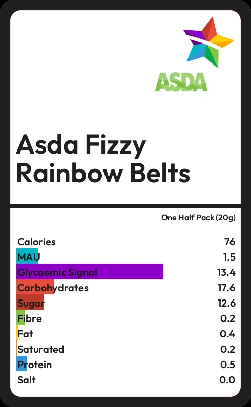 Asda Fizzy Rainbow Belts contains 12.6g sugar in one Half Pack (20g) - that is around 3 cubes of sugar.