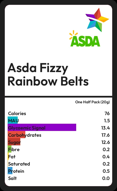 Asda Fizzy Rainbow Belts contains 75.6 calories in one Half Pack (20g).