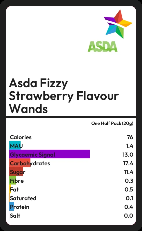 Asda Fizzy Strawberry Flavour Wands contains 76.2 calories in one Half Pack (20g).
