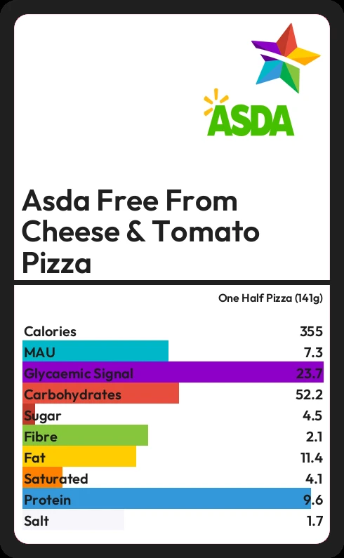Asda Free From Cheese & Tomato Pizza contains 355.3 calories in one Half Pizza (141g).