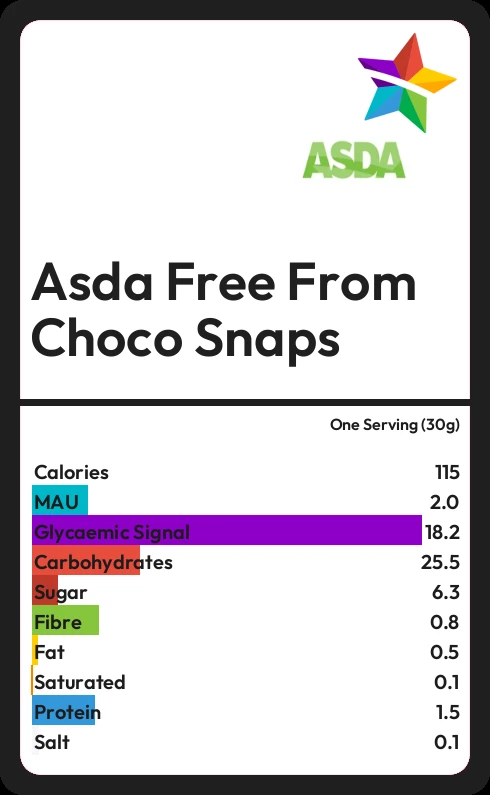 Asda Free From Choco Snaps contains 115.2 calories in one Serving (30g).