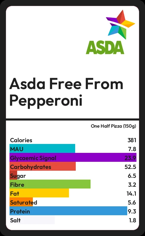 Asda Free From Pepperoni contains 381 calories in one Half Pizza (150g).