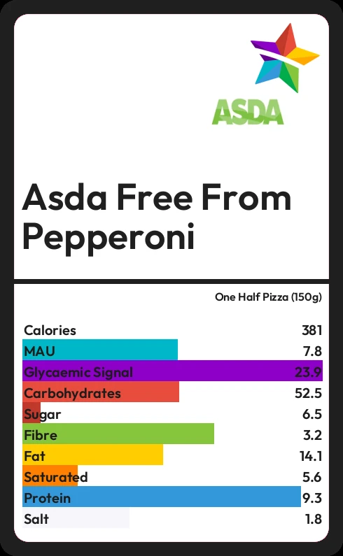 Asda Free From Pepperoni contains 381 calories in one Half Pizza (150g).
