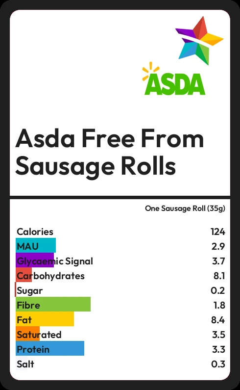 Asda Free From Sausage Rolls contains 123.9 calories in one Sausage Roll (35g).