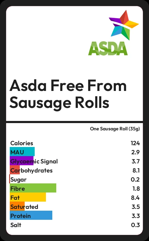 Asda Free From Sausage Rolls contains 123.9 calories in one Sausage Roll (35g).