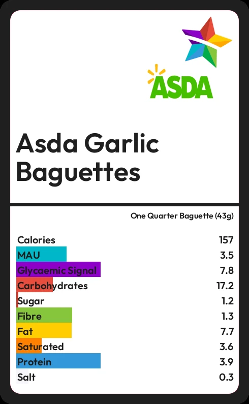 Asda Garlic Baguettes contains 1.2g sugar in one Quarter Baguette (43g)