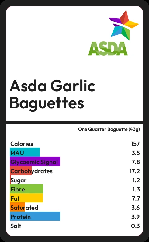Asda Garlic Baguettes contains 1.2g sugar in one Quarter Baguette (43g)