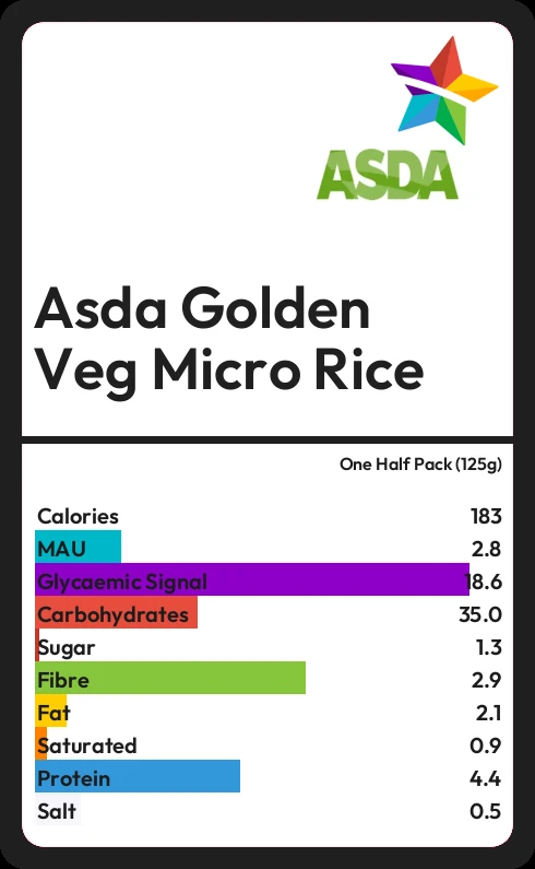Asda Golden Veg Micro Rice contains 1.3g sugar in one Half Pack (125g)