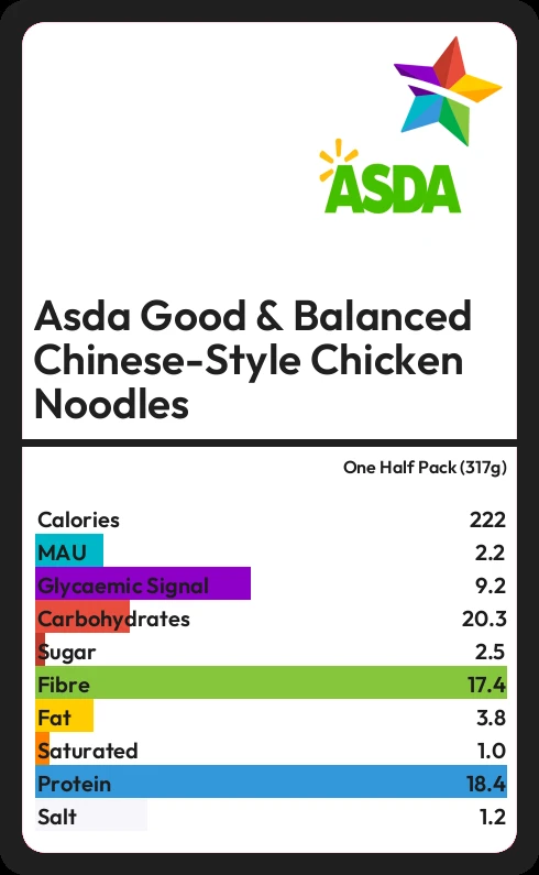 Asda Good & Balanced Chinese-Style Chicken Noodles contains 221.9 calories in one Half Pack (317g).