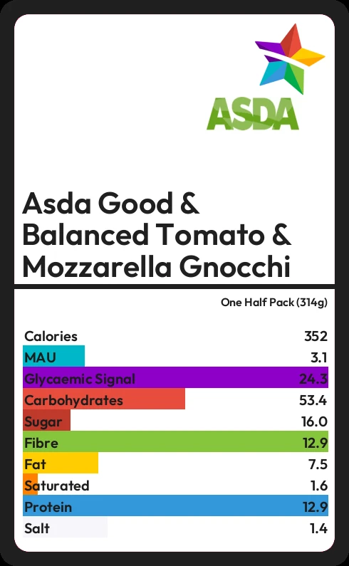 Asda Good & Balanced Tomato & Mozzarella Gnocchi contains 16.0g sugar in one Half Pack (314g) - that is around 4 cubes of sugar.